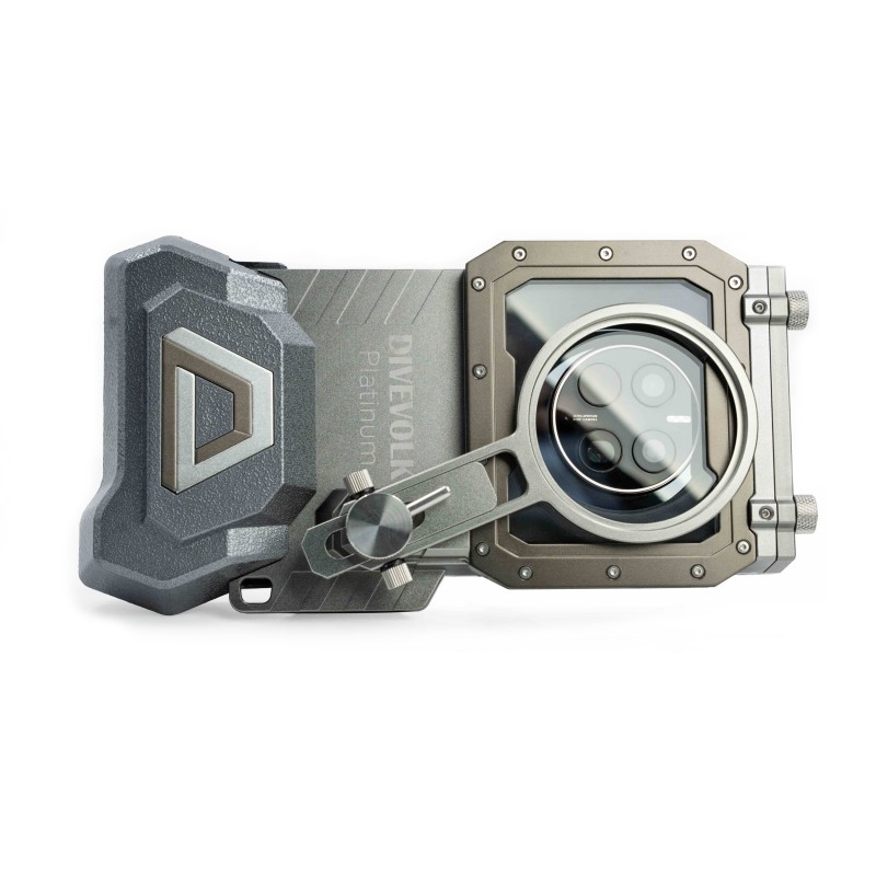 Obudowa podwodna do smartfona Platinium DIVEVOLK SeaTouch 4 MAX. Wersja PLATINIUM wykonana jest z aluminium oraz posiada w zestawie otwory do przymocowania do podstawy, a także ramię do zamontowania filtrów i obiektywów. Posiada dotykową membranę, dzięki której możemy sterować naszym smartfonem pod wodą dokładnie tak samo jak na powierzchni.